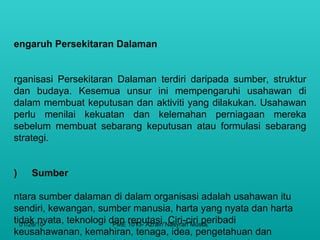 Faktor dalaman yang mempengaruhi syarikat adalah faktor seperti pekerja pemberi maklumat pelanggan pembekal dan budaya organisasi. Berfungsi dan merangkumi faktor-faktor atau pihak-pihak yang. Mereka adalah elemen dalam persekitaran yang boleh menghakis kedudukan pasaran syarikat.